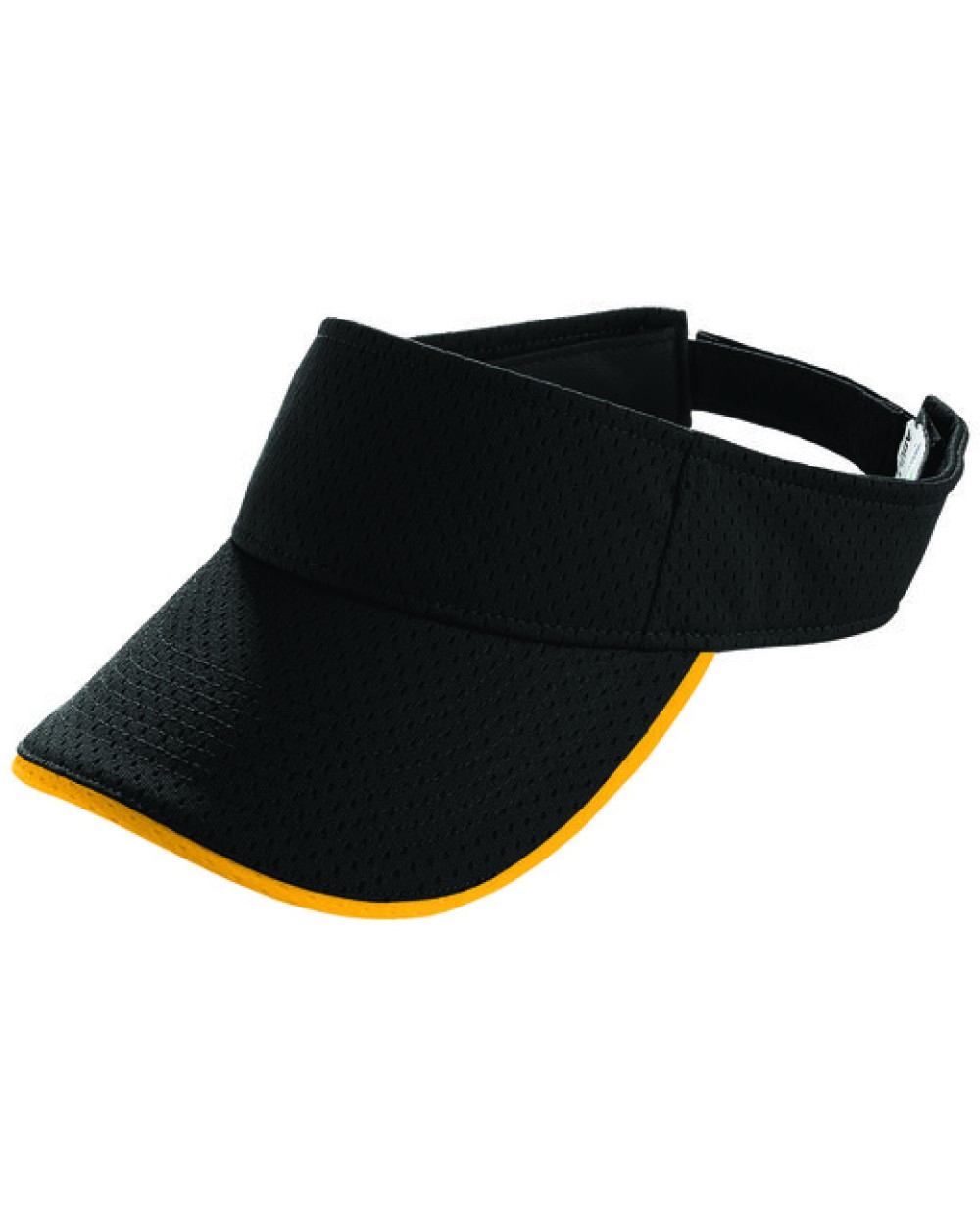 100% polyester athletic mesh with tricot backing; Three panels; Contrasting color bill edge; Sweatband folds down for easy embellishment; Pre-curved bill; Hook-and-loop fastener;