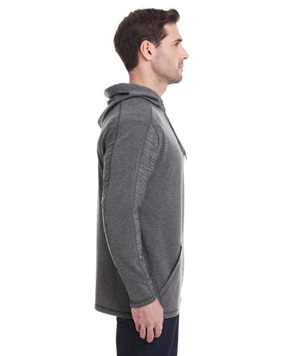 8 oz., stretch & sueded triblend terry; 51% rayon, 43% polyester, 6% elastine; 4-way stretch fabric withstriped loop back yarns; Advanced raglan sleeves with underarm gussets; Wrap back panel & front pouch pocket;