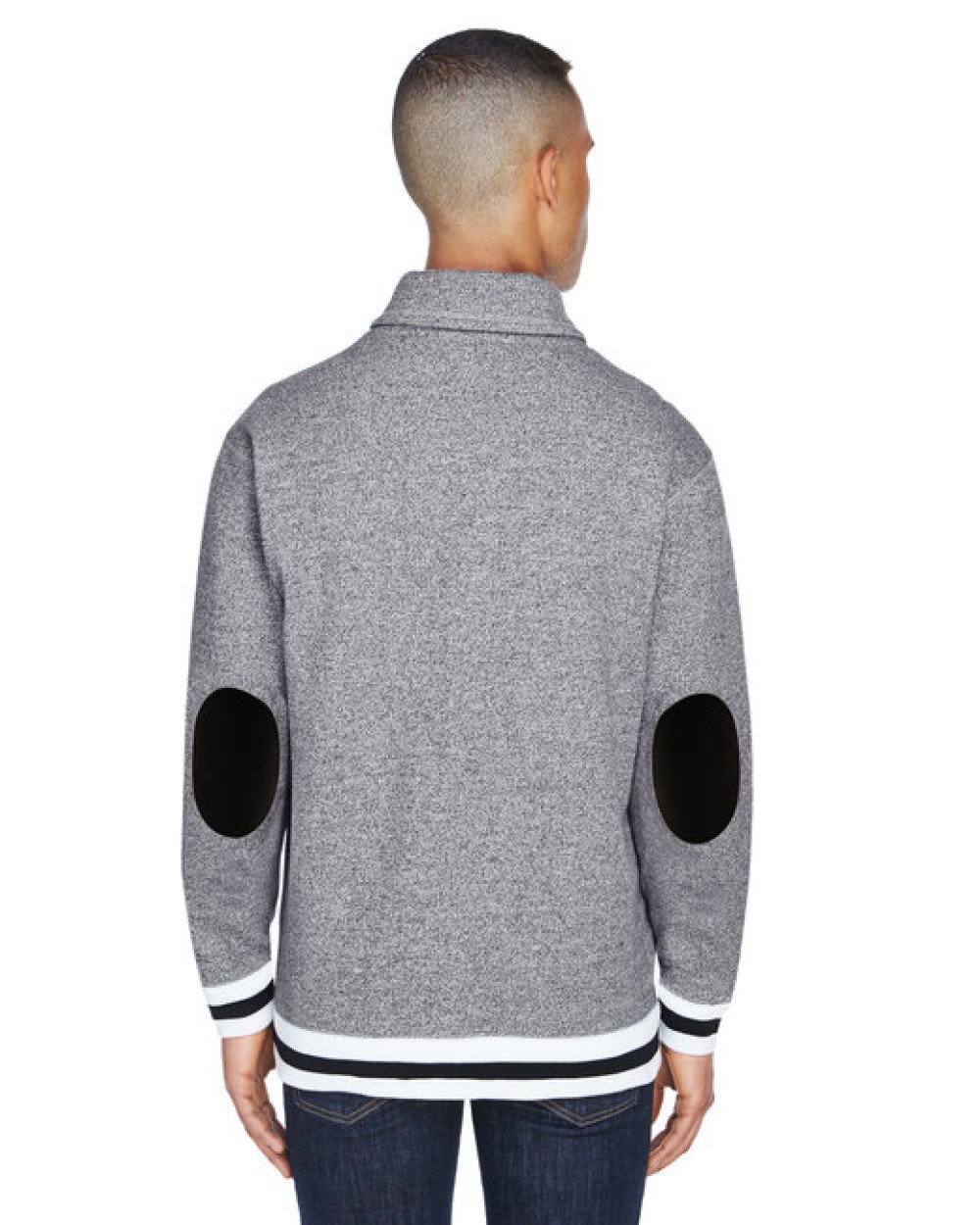 9.25 oz., 80% cotton 20% polyester heathered fleece; 1×1 yarndyed cuffs and waist; Unique shawl collar design; Contrast fleece elbow patches; Set-on pouch pocket;