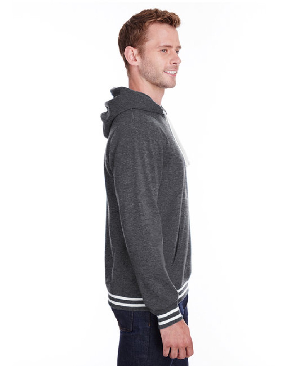 6.5 oz., 60% cotton 40% polyester single-dyed fleece; 1×1 rib yarn-dyed stripe cuffs and waist; off white drawcords; set-on pouch pocket;