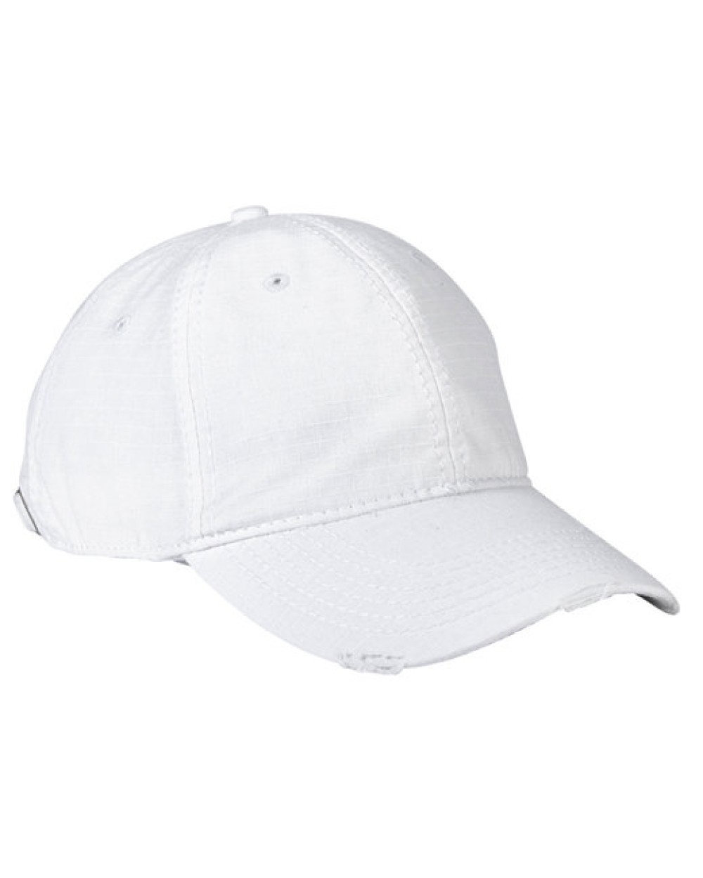100% cotton ripstop fabric; 100% cotton rip stop fabric; Self fabric back strap with silver clasp and buckle; Heavy distressing on visor; Self-fabric color under visor; Matching color eyelets, sweatband and seam tape; Matching color heavy raised stitching on crown and visor; Pre-curved visor; 6-panel, unstructured, low-profile with heavy enzyme wash;