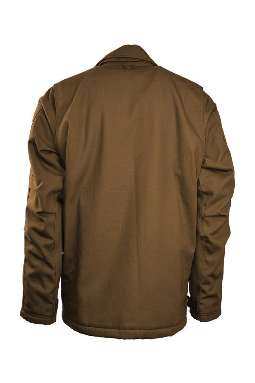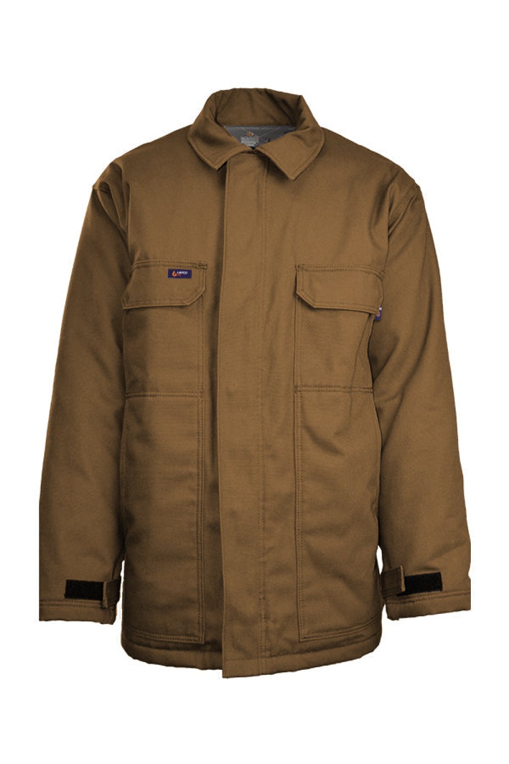 Outer: 8.5oz. 100% Cotton PU Laminate Duck/ Lining: 12oz. Quilted Lining 46% Cotton 50% FR Non Woven Modacrylic 4% FR Polyester FR INSULATED CHORE COAT