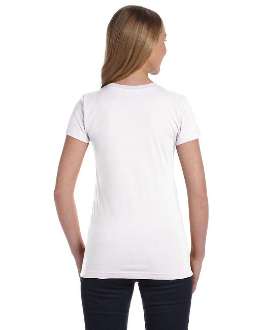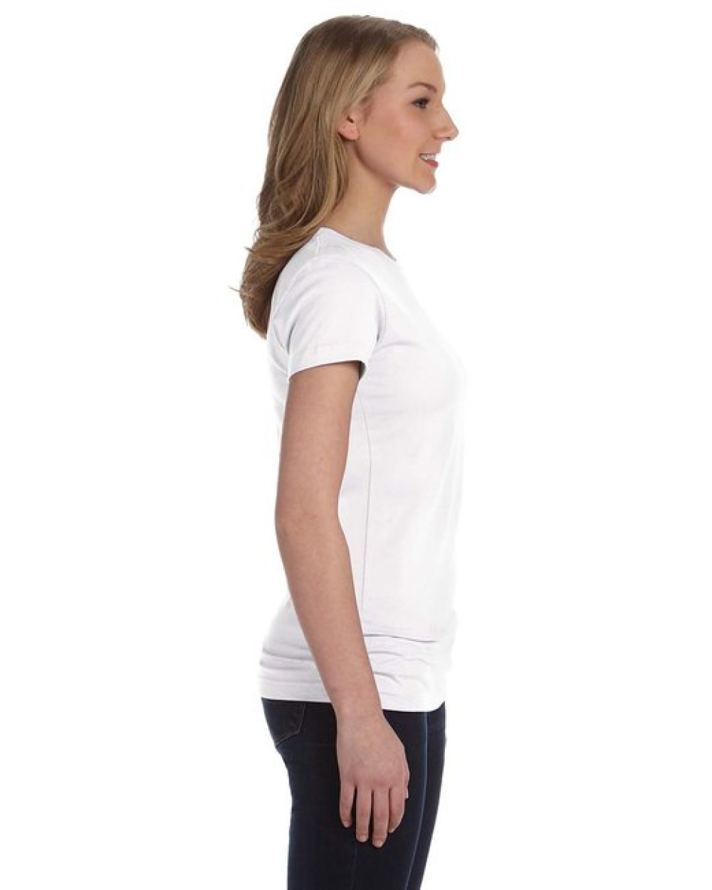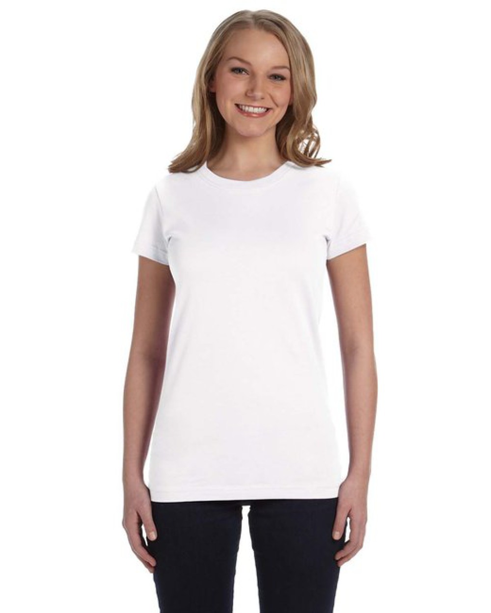 4.5 oz., 100% combed ringspun cotton fine jersey ; Ash is 98/2; Heather is 93/7 combed ringspun cotton/polyester; Ash and White are sewn with 100% cotton thread; Topstitched ribbed collar; Self-fabric back neck tape; Double needle sleeves and bottom hem; Side seam construction; EasyTearô label; Machine washable/ tumble dry low; Fit: Ladies’ Junior – Fitted;