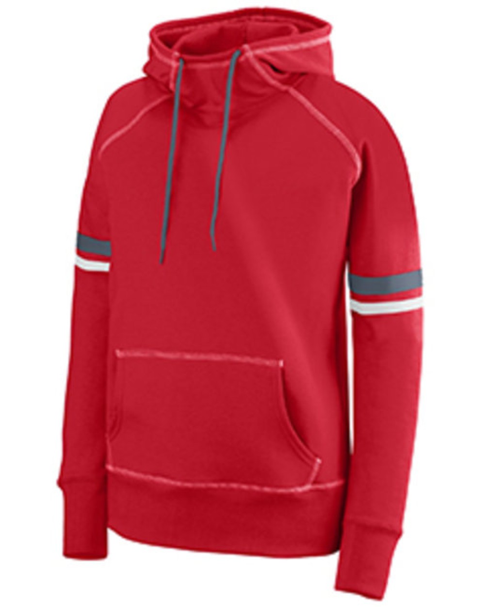9-ounce 50% cotton/50% polyester smooth athletic fleece ; Ladies' fit ; Raglan sleeves with two-color contrast stripes and thumbholes for warmth ; Contrast-color drawcord in scuba shaped hood on sizes M-2XL only ; Contrast-color three-needle coverstitching ; Front pouch pocket ; 1 x 1 rib-knit cuffs and bottom band;
