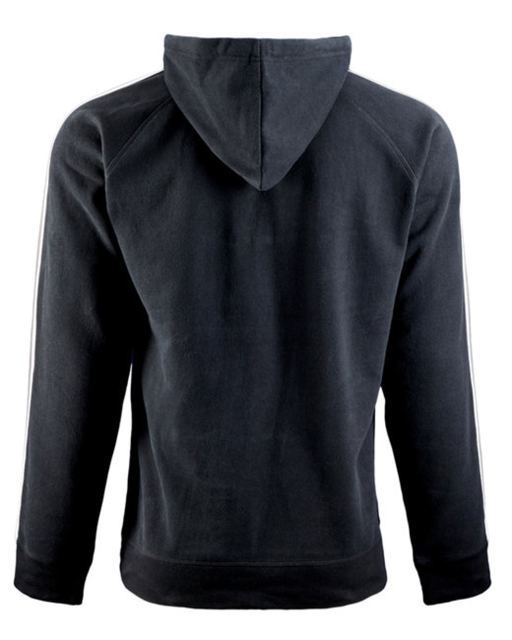 8 oz., 60% cotton, 40% polyester sueded fleece; 1î wide set-on striped woven taping along sleeves; Jersey-lined hood with sewn eyelets and matching drawcords; Twill tape back of neck tape; 1×1 rib cuffs and waistband; Set-on pouch pocket; Tear away label;