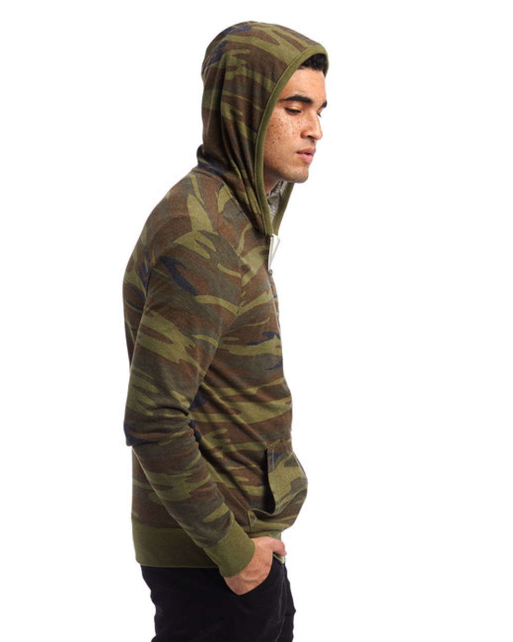 4.13 oz., 20 singles; 50% polyester, 38% cotton, 12% rayon; Regular fit; Fabric printed and garment-washed; Brushed nickel zipper with natural tape; Front pouch pocket;