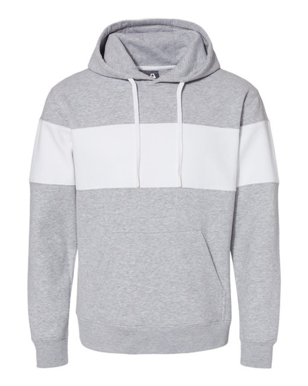 8 oz., 60% cotton, 40% polyester sueded fleece; 3-piece jersey-lined hood with sewn eyelets and contrast drawcords; Contrast self fabric panels on chest, arms, and hood; Contrast twill tape back of neck tape; 1×1 rib cuffs and waistband; Set-on pouch pocket; Tear away label;