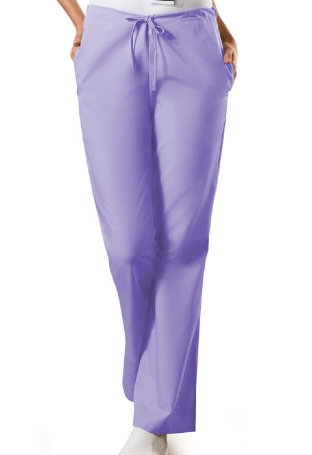 Side vents at the bottom of this flare leg pant make a fashion statement. An adjustable front drawstring, back elastic waist, front angled pockets, one back patch pocket, and side vents are also featured. Inseam 28.5″.