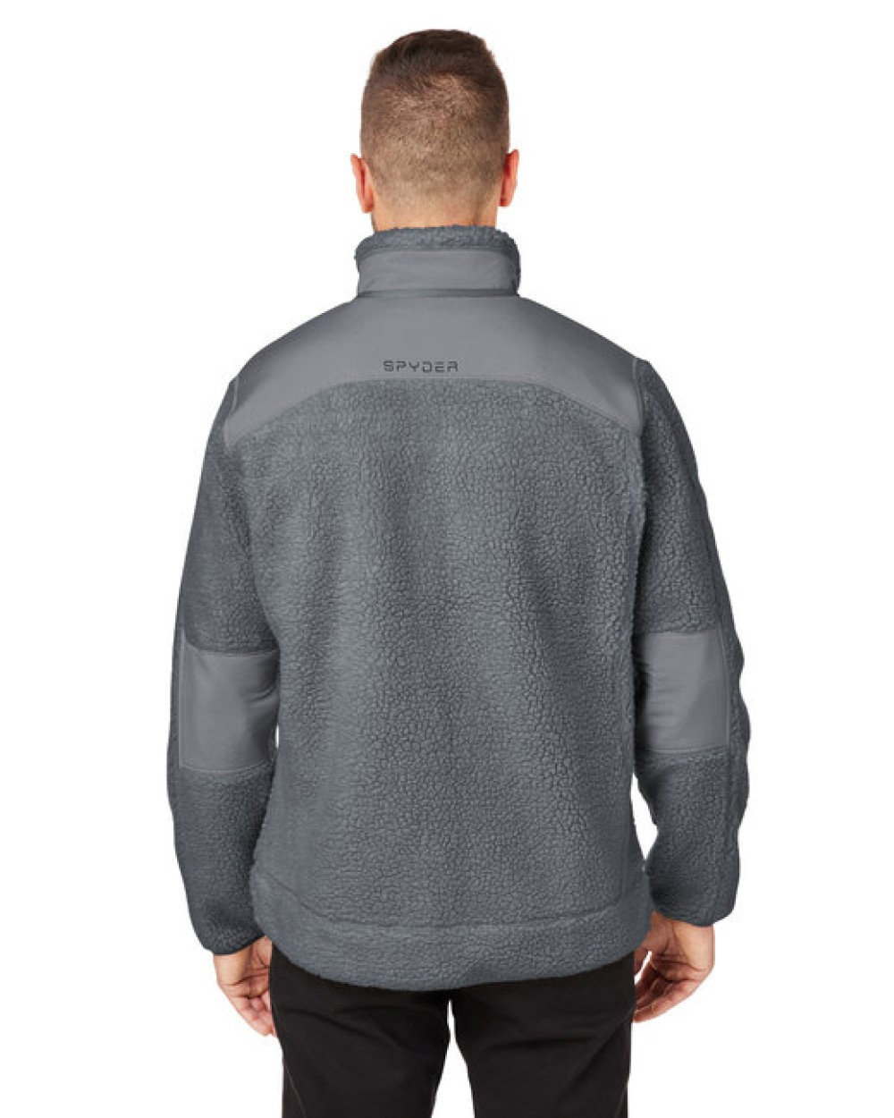 Bonded Sherpa: 100% polyester, 300 grams; Stretch Nylon: 82% nylon, 18% elastane; Full-zip front closure; Debossed Spyder neck tape & internal locker loop; Internal draft flap; Vertical-zippered chest pocket with stylized Spyder grommet ; Inseam pockets with rubber ëSpyderí zip closure; Stylized front and back yoke seams; Elastic cuff and hem binding; High-definition rubberized Spyder wordmark ; Raised silicone Spyder Bug patch;