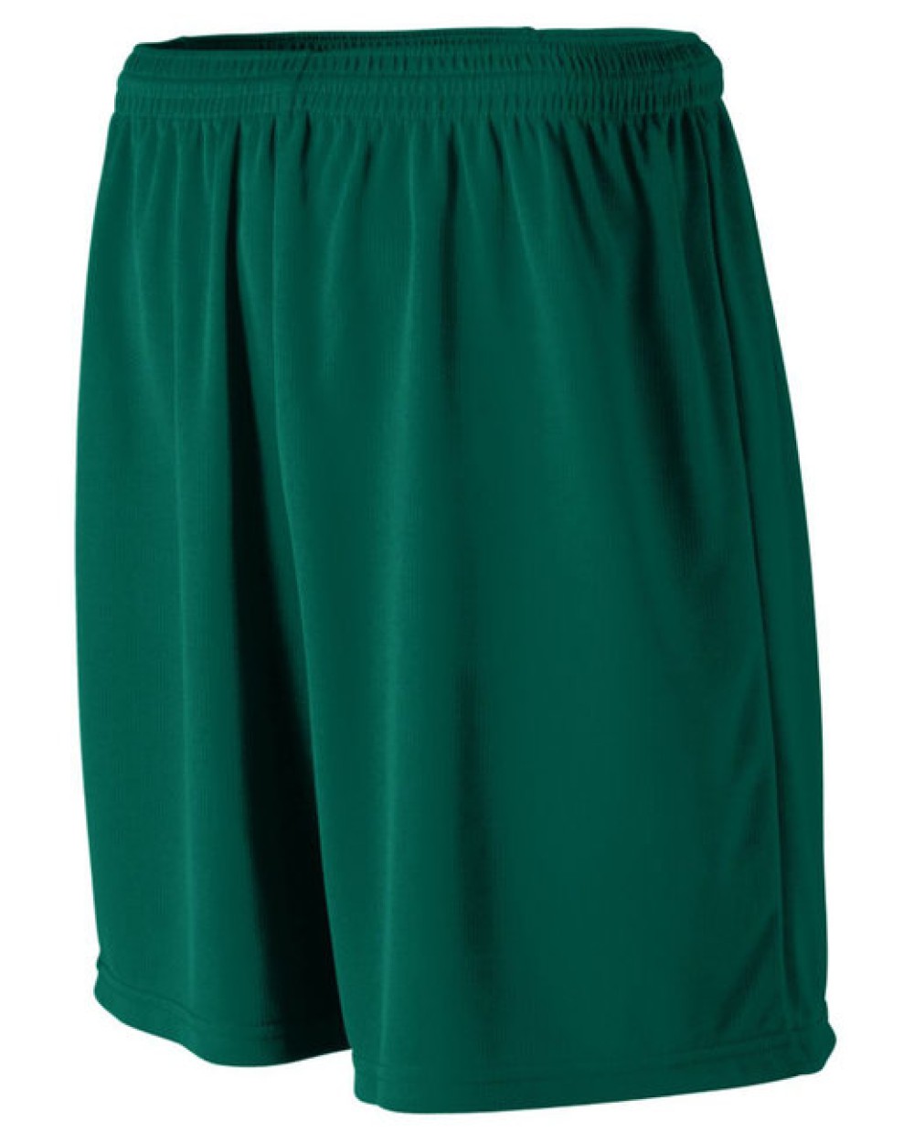 100% polyester wicking mesh ; Wicks moisture way from the body; Full-cut; Covered elastic waistband with inside drawcord; 5-inch inseam; Double-needle hemmed bottom.;