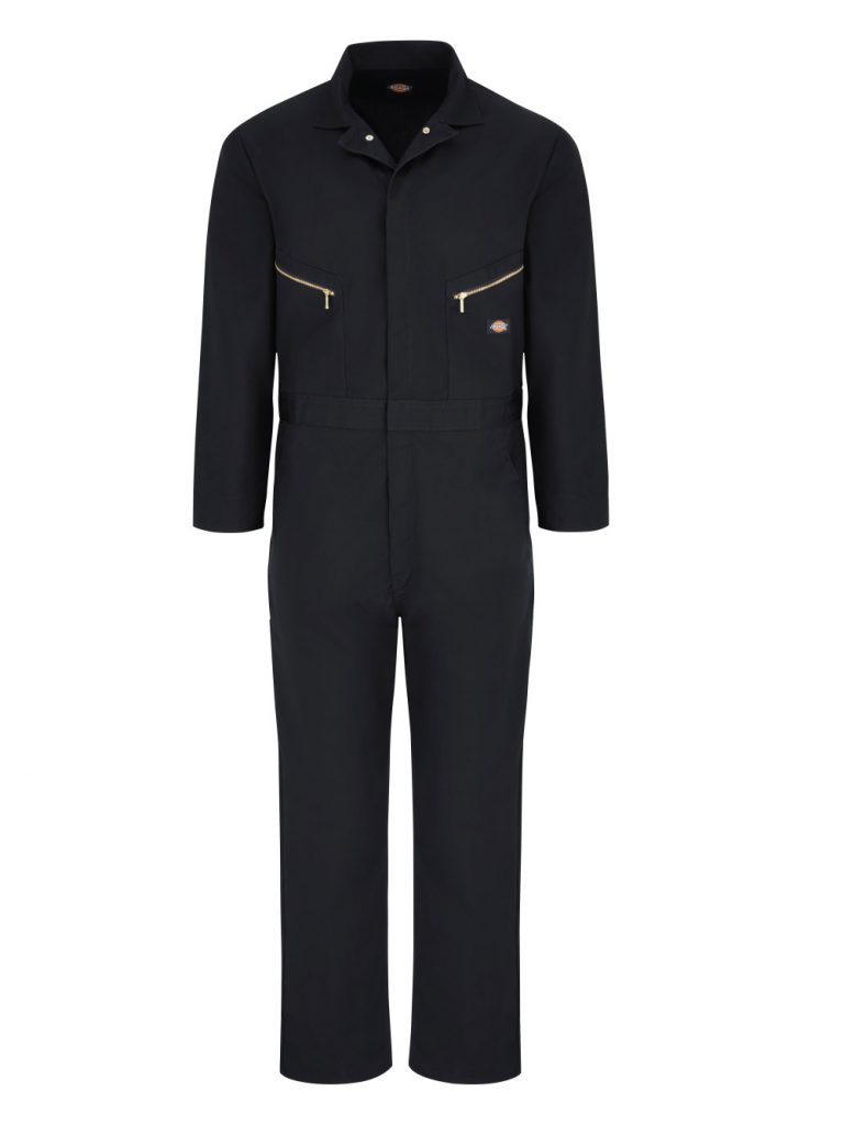 …it. Durable, yet breathable, polyester/cotton twill resists fading, wrinkles and stains. Heavy-duty, two-way front brass zipper with concealed snaps at neck and waist stays flat. Handy ruler/tool pocket on right…