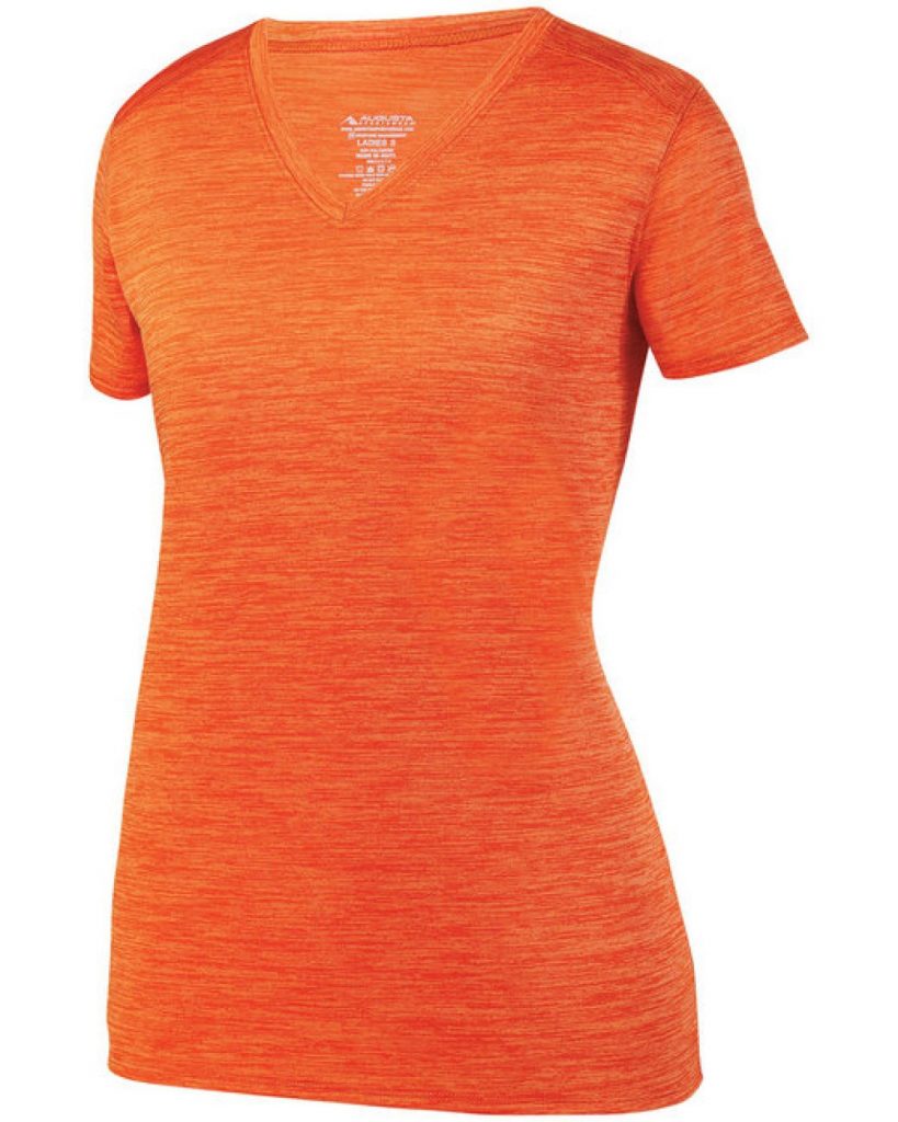 100% polyester heathered wicking knit ; Wicks moisture away from the body ; Ladies’ fit ; Pad print label ; Self-fabric V-neck collar ; Set-in sleeves ; Double-needle hemmed bottom…