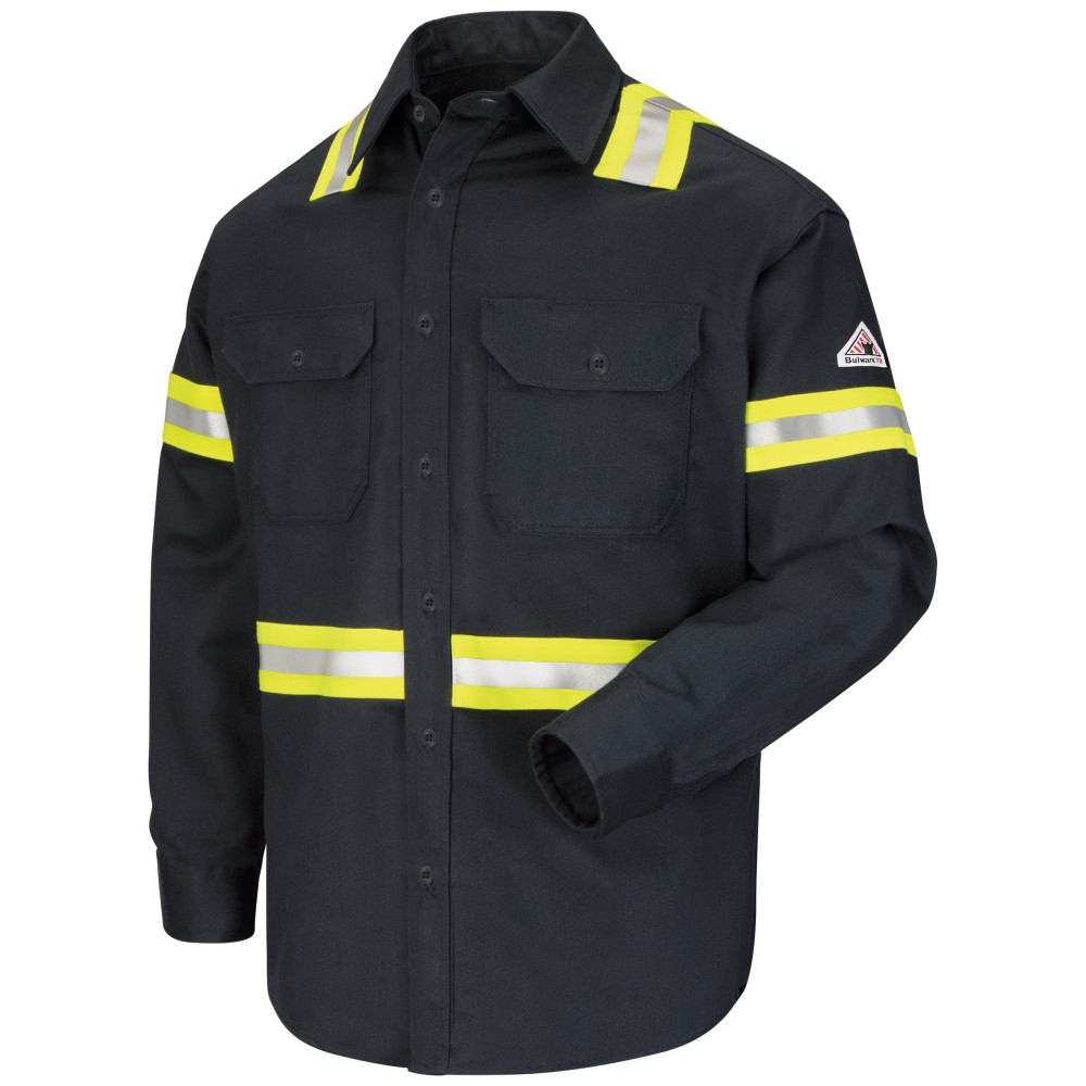 …favorite FR work shirt combined with your hi-vis vest. CAT 2 AR/FR protection and NFPA® 2112 compliant, with 2″ reflective striping for 360˚ visibility to keep you seen and safe….