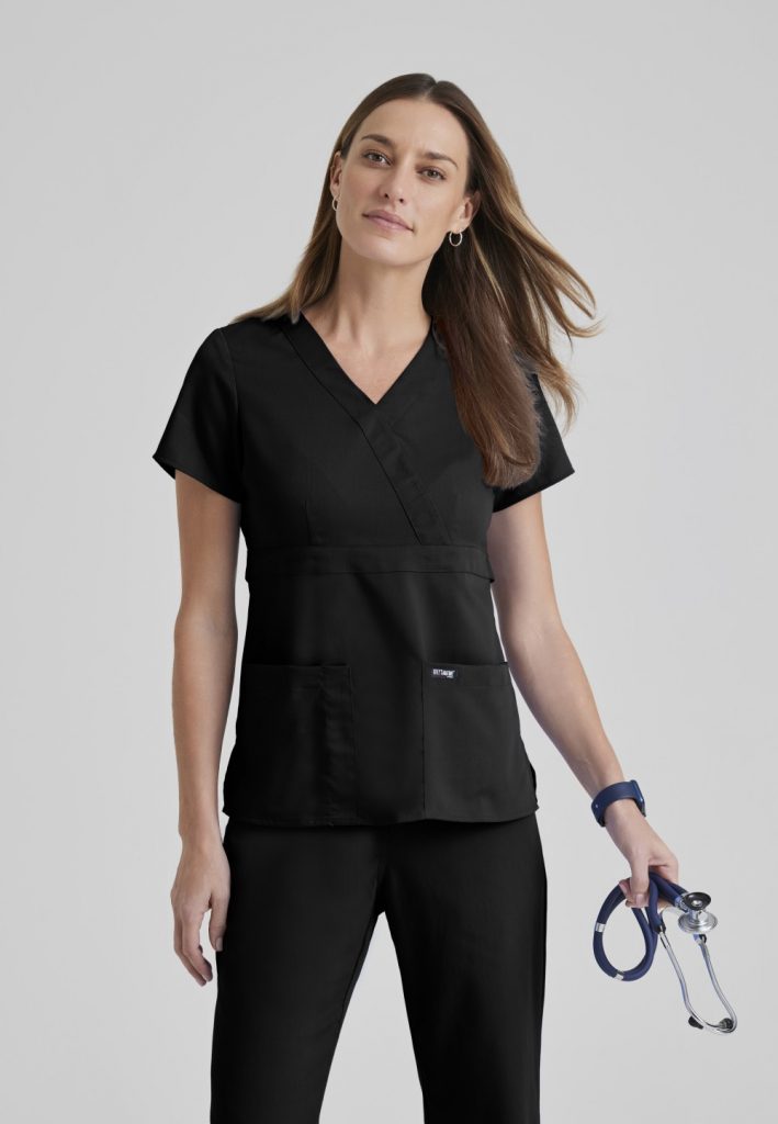 …Soft-touch fabric Adjustable tab back construction Three front pockets Mock wrap V-neck Soil-release fabric Wicks moisture for all day freshness Easy care Center back length: 25″ (small) 77% Polyester 23%…